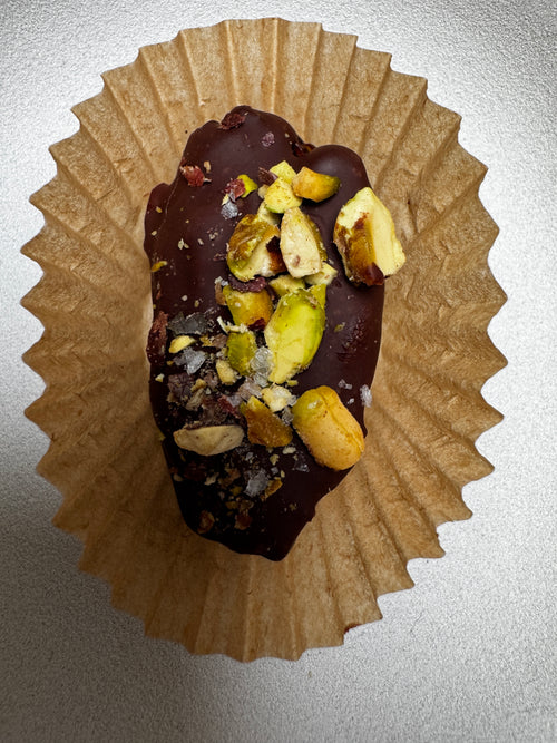 Organic Medjool date*, pure almond butter (just almonds), dark chocolate*, crushed pistachios, flaky sea salt.