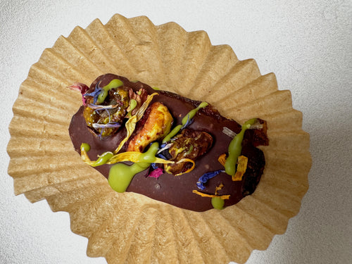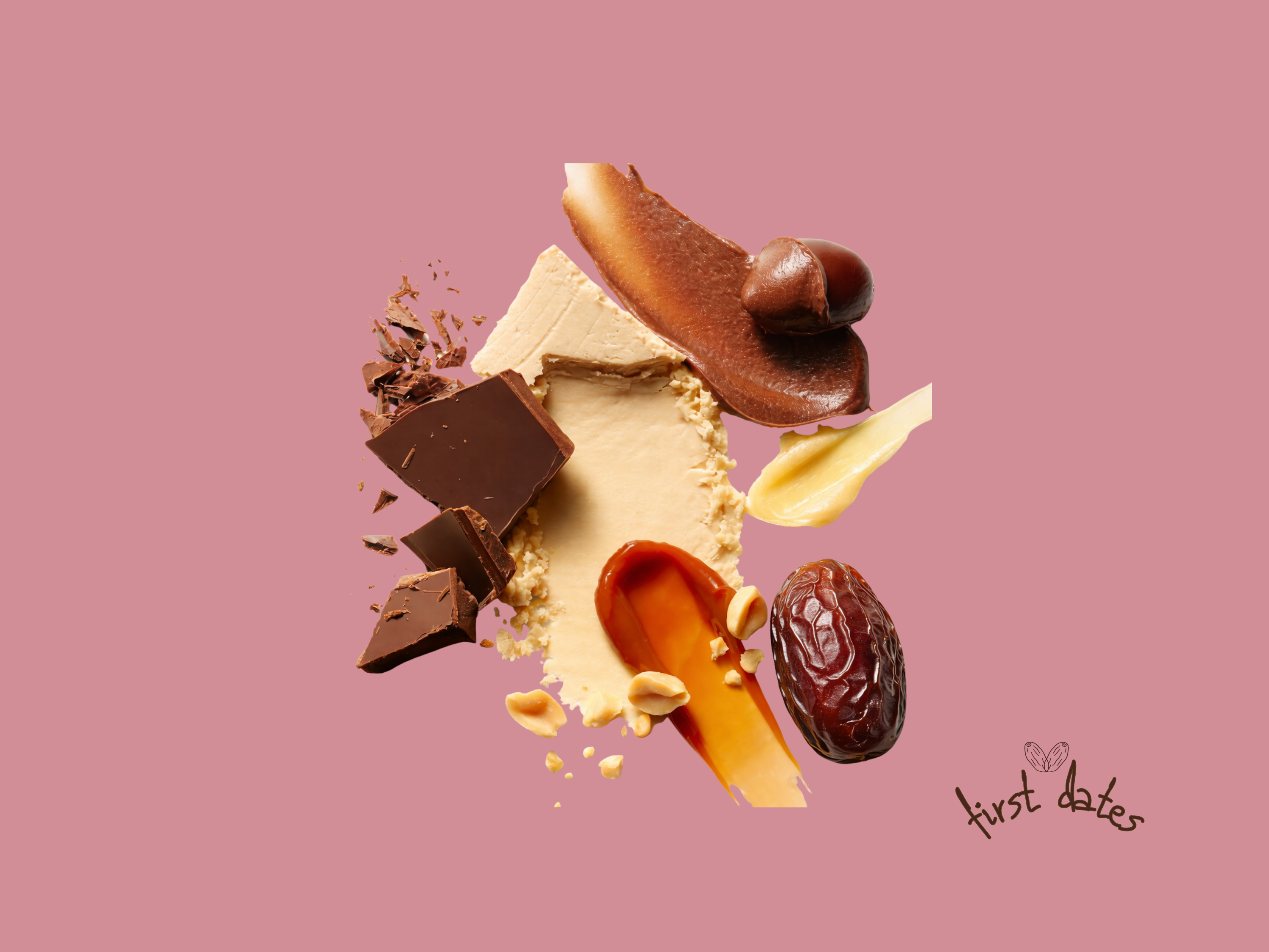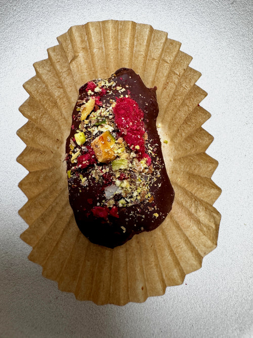 A soft Medjool date* filled with almond butter and rose-infused Iranian pistachios, dipped in dark chocolate and finished with a delicate matcha chocolate drizzle and flakey sea salt. Topped with edible flowers. Lightly floral, a little unexpected, almost too pretty to eat. Almost.